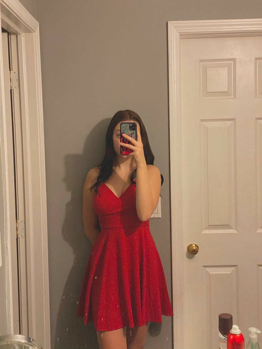 Robe de soirée courte rouge brillante à bretelles spaghetti en satin et paillettes, tenue d'anniversaire pour 20 ans, C5044
