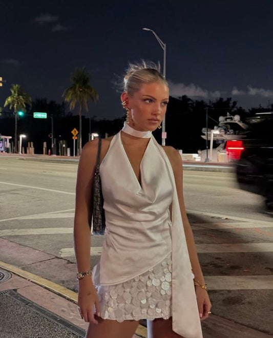 Robe de soirée courte en satin à sequins, coupe trapèze, dos nu, chic, tenue d'anniversaire pour 22 ans, C4824