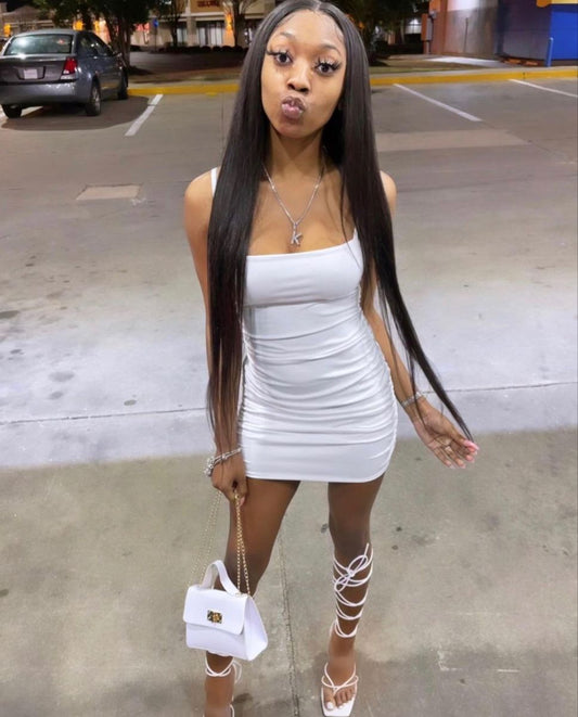 Robe de soirée courte moulante et sexy en satin blanc à bretelles spaghetti pour 21e anniversaire C5397