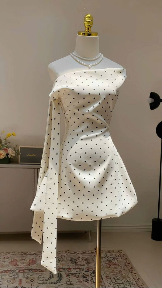 Robe courte en satin à pois, coupe trapèze, épaules dénudées, tenue de soirée pour 19e anniversaire, C6040