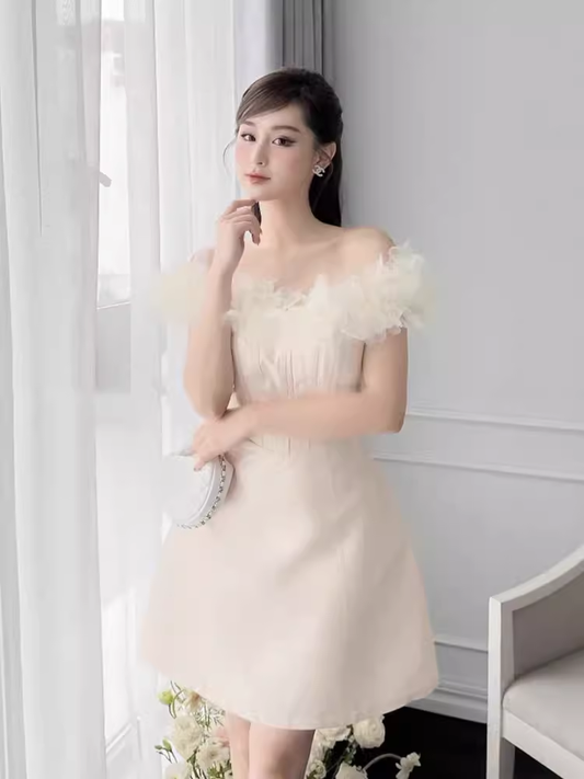 Robe trapèze courte blanche, asymétrique épaule dénudée, tenue d'anniversaire, robe de soirée, C537