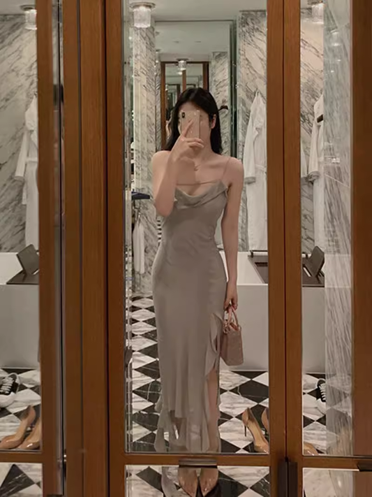 Robe de soirée simple à bretelles fourreau sans manches en satin de soie vert sauge C1856