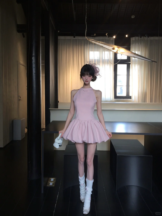Robe de soirée courte en satin rose à col licou et ligne A pour anniversaire, tenue de fête, C4574