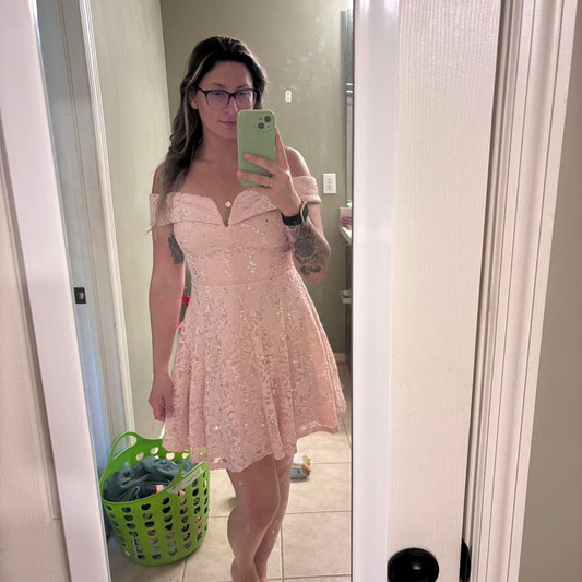 Robe de bal rose à épaules dénudées et dentelle satinée, tenue de bal courte pour anniversaire, 20e anniversaire, C4930