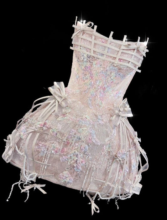 Robe de soirée courte rose en satin à sequins, coupe trapèze, sans bretelles, tenue d'anniversaire, 16e anniversaire, C5874