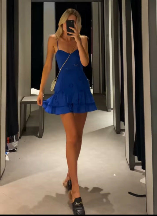Robe de soirée courte en satin bleu roi, coupe trapèze, bretelles spaghetti, ajourée, tenue pour 18e anniversaire, C5172
