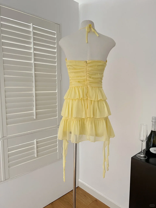Robe de soirée courte jaune en mousseline de soie, coupe licou, à volants, tenue d'anniversaire pour 19 ans, C4760