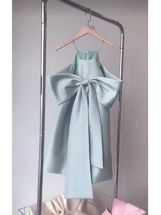 Jolie robe de demoiselle d'honneur trapèze en satin avec nœud papillon et dos nu C6081
