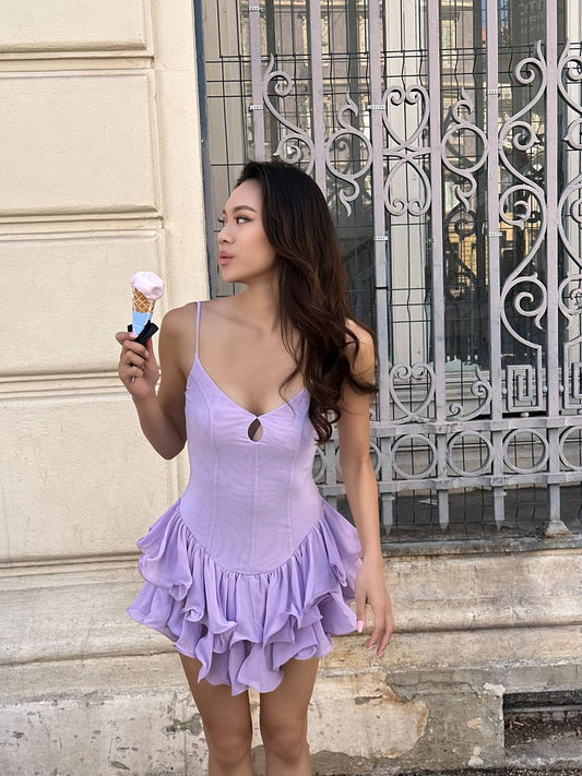 Robe de soirée courte en satin lilas à bretelles spaghetti et ourlet à volants, tenue de soirée pour 19e anniversaire, C5224