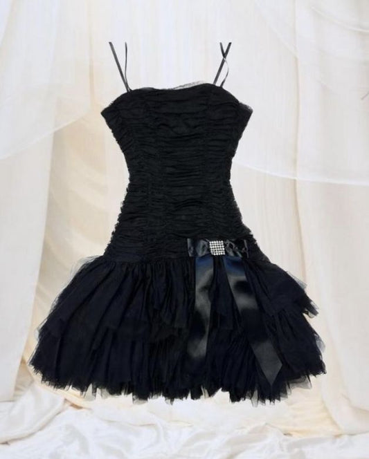Robe courte noire trapèze en satin et tulle à bretelles spaghetti pour fête d'anniversaire de 16 ans, C5931