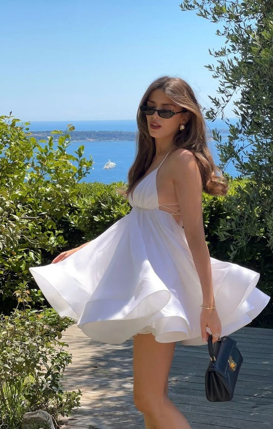 Robe de soirée courte et sexy blanche en satin, coupe trapèze, col en V, dos nu, tenue de soirée pour 19e anniversaire, C4777