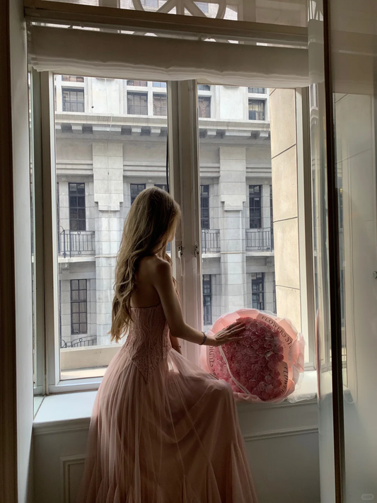 Robe de bal longue en tulle et dentelle, élégante, coupe trapèze, sans bretelles, C4781