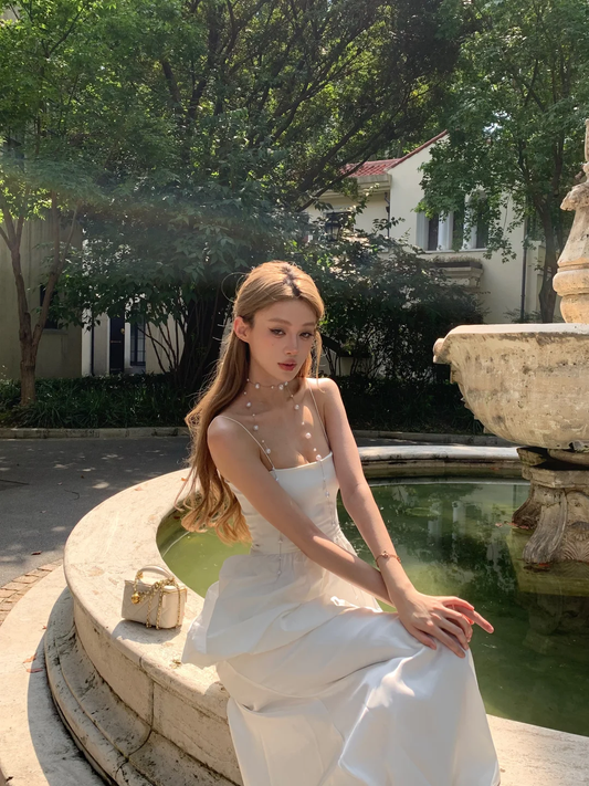 Robe de bal longue en satin à bretelles spaghetti et coupe trapèze chic C4783