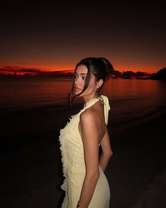 Robe de bal longue en mousseline de soie jaune pastel, jolie robe sirène dos nu, à volants, C4784