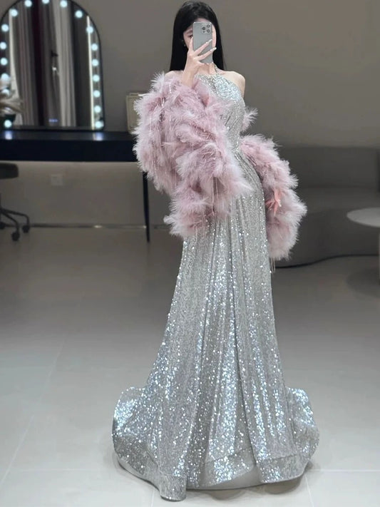 Superbe robe de soirée longue à paillettes rose à épaules dénudées, robe de bal, tenue d'anniversaire C3594