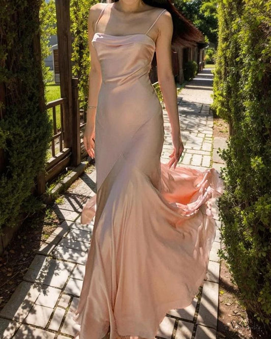 Robe de bal longue simple à bretelles spaghetti rose sirène avec fente C3164