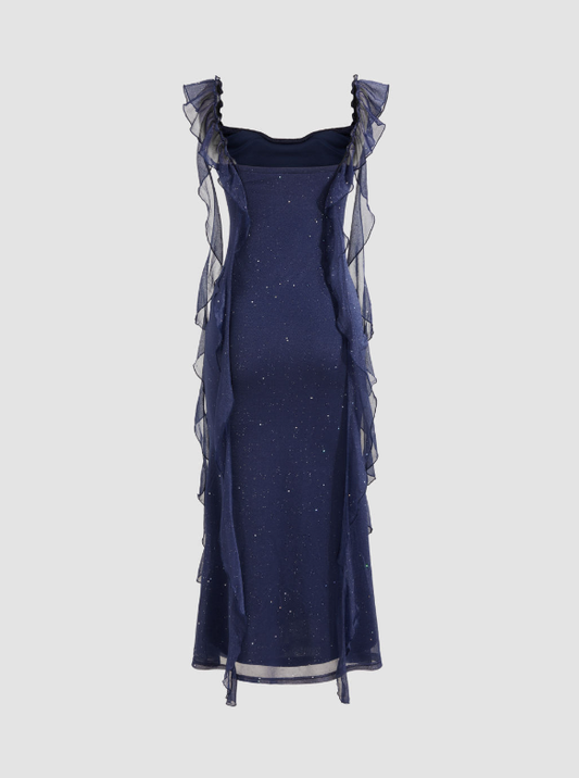 Robe de soirée élégante à encolure carrée en mousseline de soie bleu marine à volants C2733
