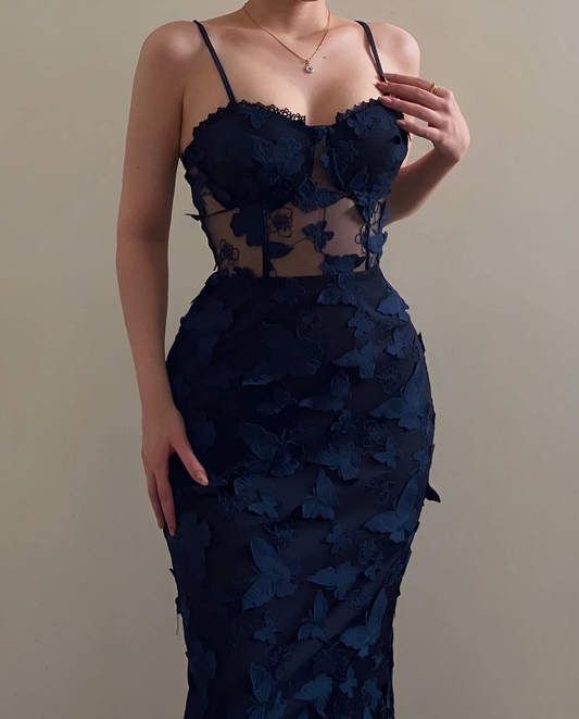 Robe de soirée longue élégante à bretelles spaghetti en dentelle bleu marine C2741