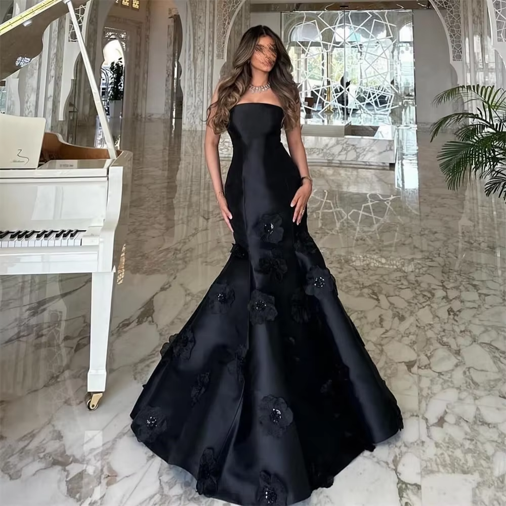 Robe de soirée longue en satin noir sans bretelles et élégante de style sirène C3172