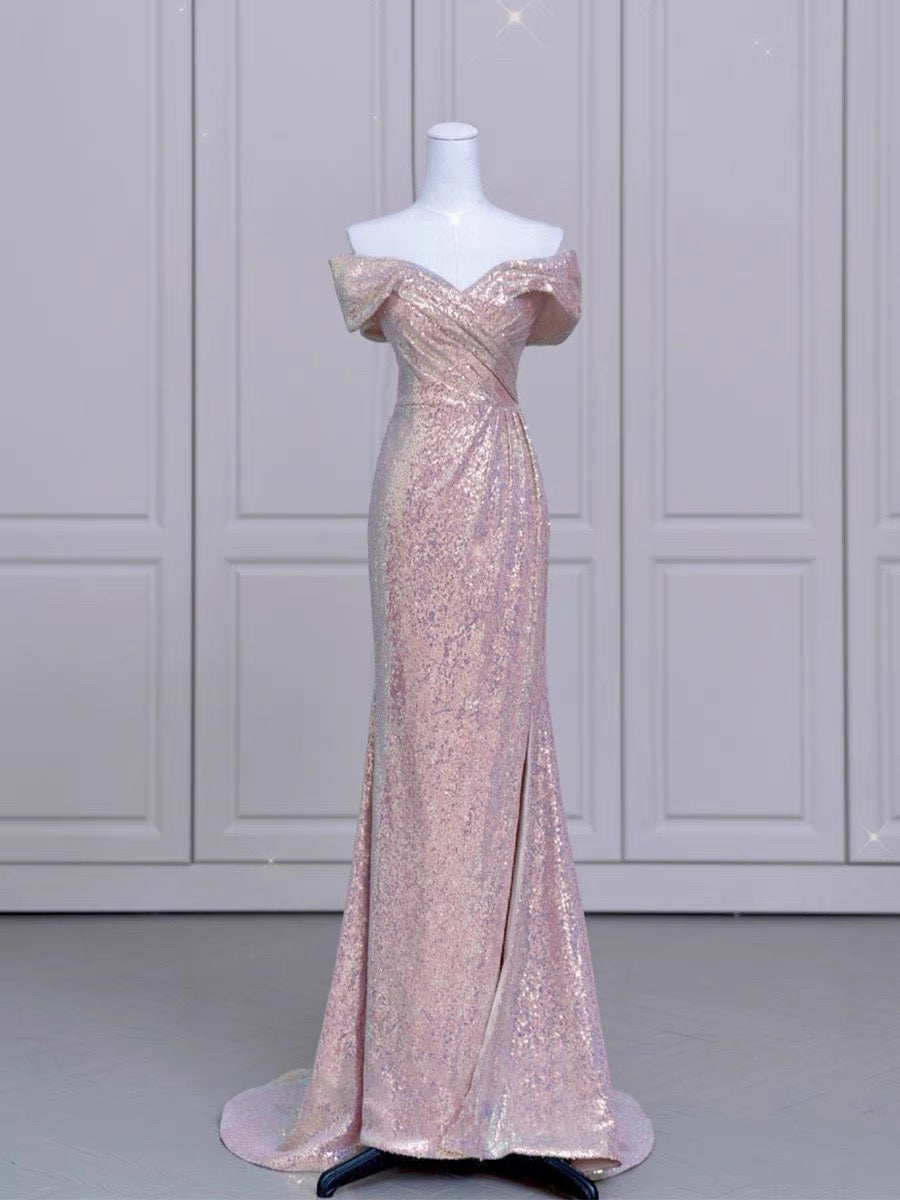 Robe de soirée longue élégante à paillettes rose et épaules dénudées avec sirène C3239