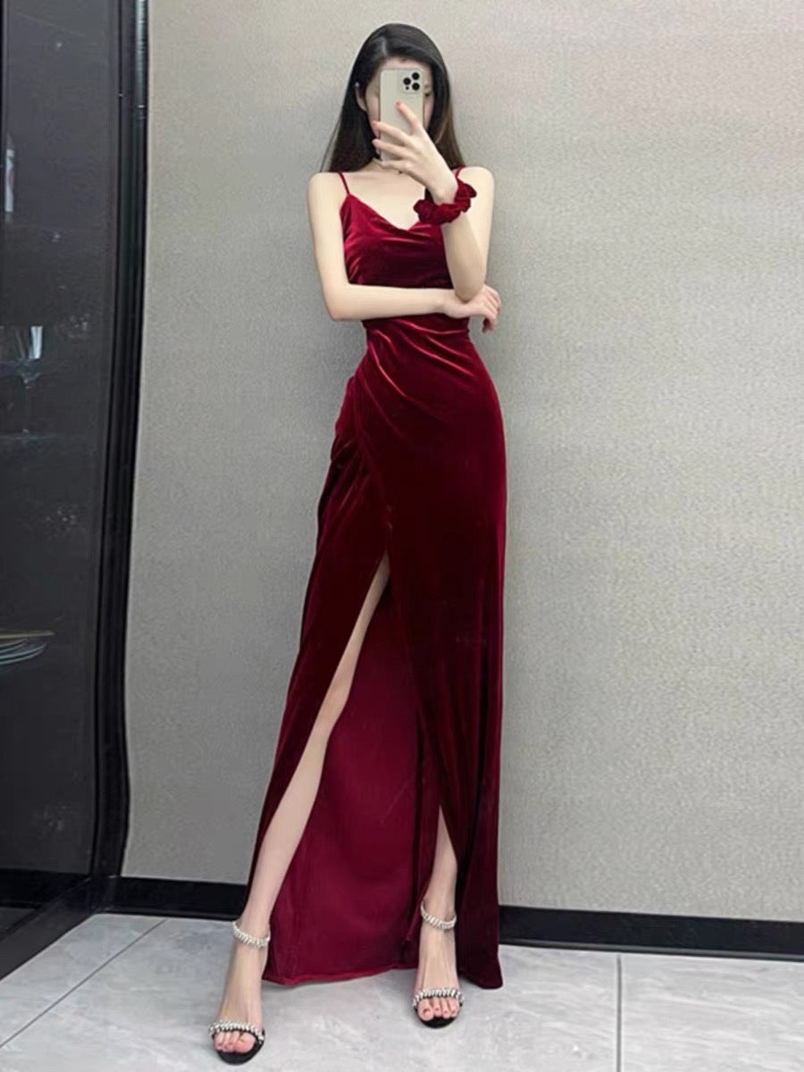 Robe de soirée longue en velours rouge à bretelles spaghetti élégantes C3237