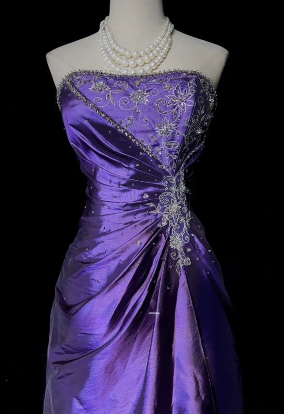 Robe de bal longue violette plissée en satin et dentelle, sans manches, coupe trapèze, sans bretelles, ornée de perles et de perles. Référence C6463