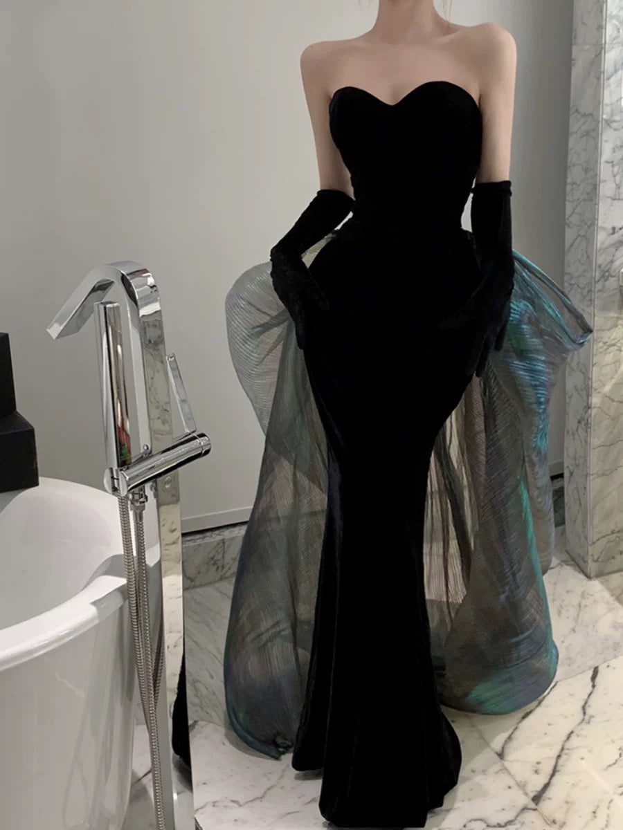 Robe de soirée noire modeste sans bretelles style sirène avec gants et sans manches C3673