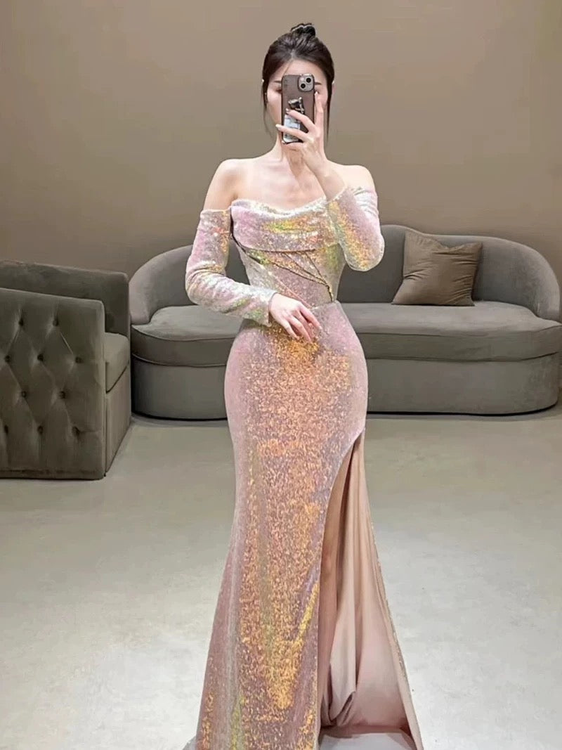 Elegant Mermaid Strapless Pink Slit Sequin Long Prom Dress Evening Dresses C3270