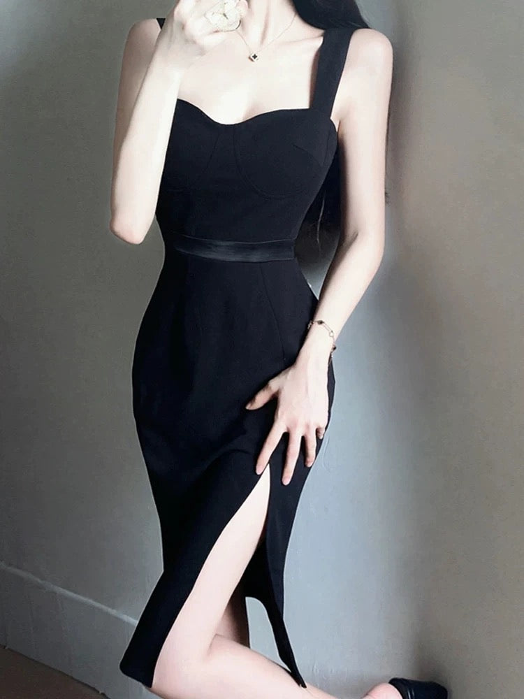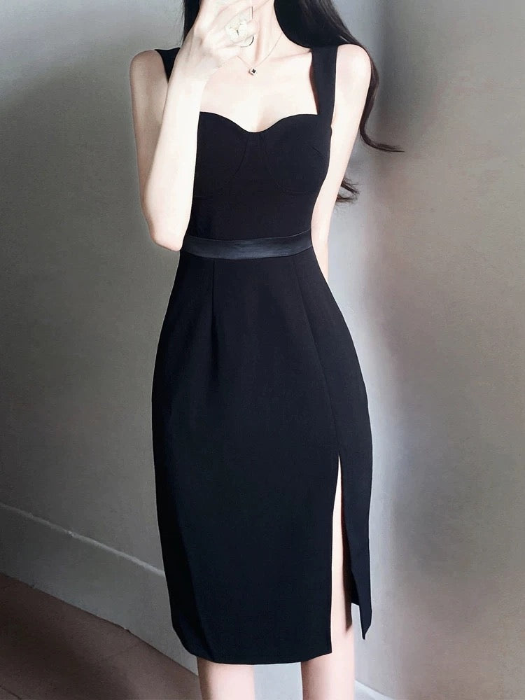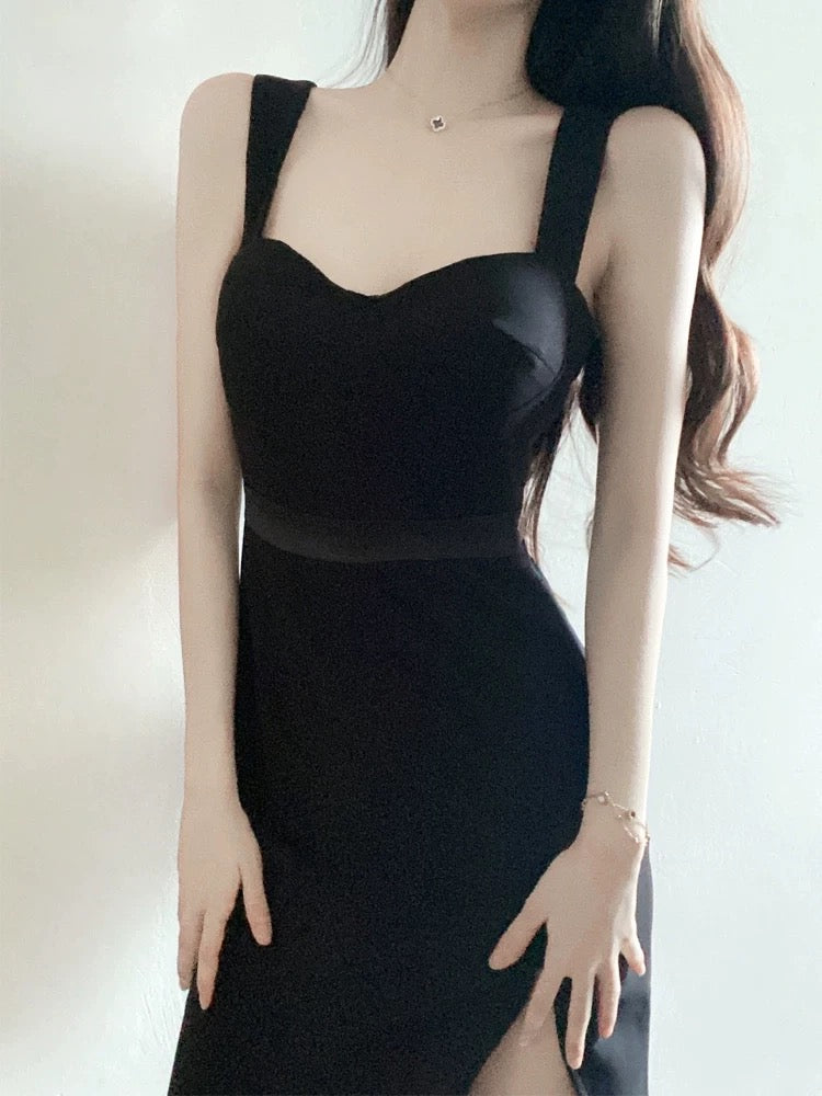 Elegant Sheath Straps Black Split Satin Prom Dress Birthday Outfits C3652