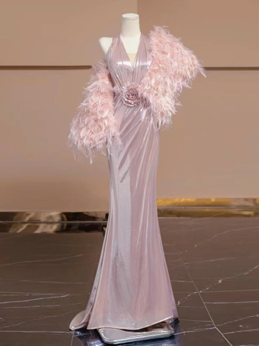 Elegant Sheath V Neckline Pink Sequin Long Prom Dress Evening Dresses With Flowers C3254