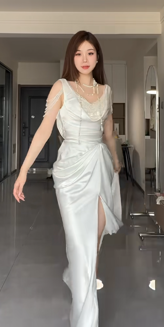Elegant White Mermaid Satin Beaded Slit Without Sleeves Long Prom Dress, Evening Dress C6548