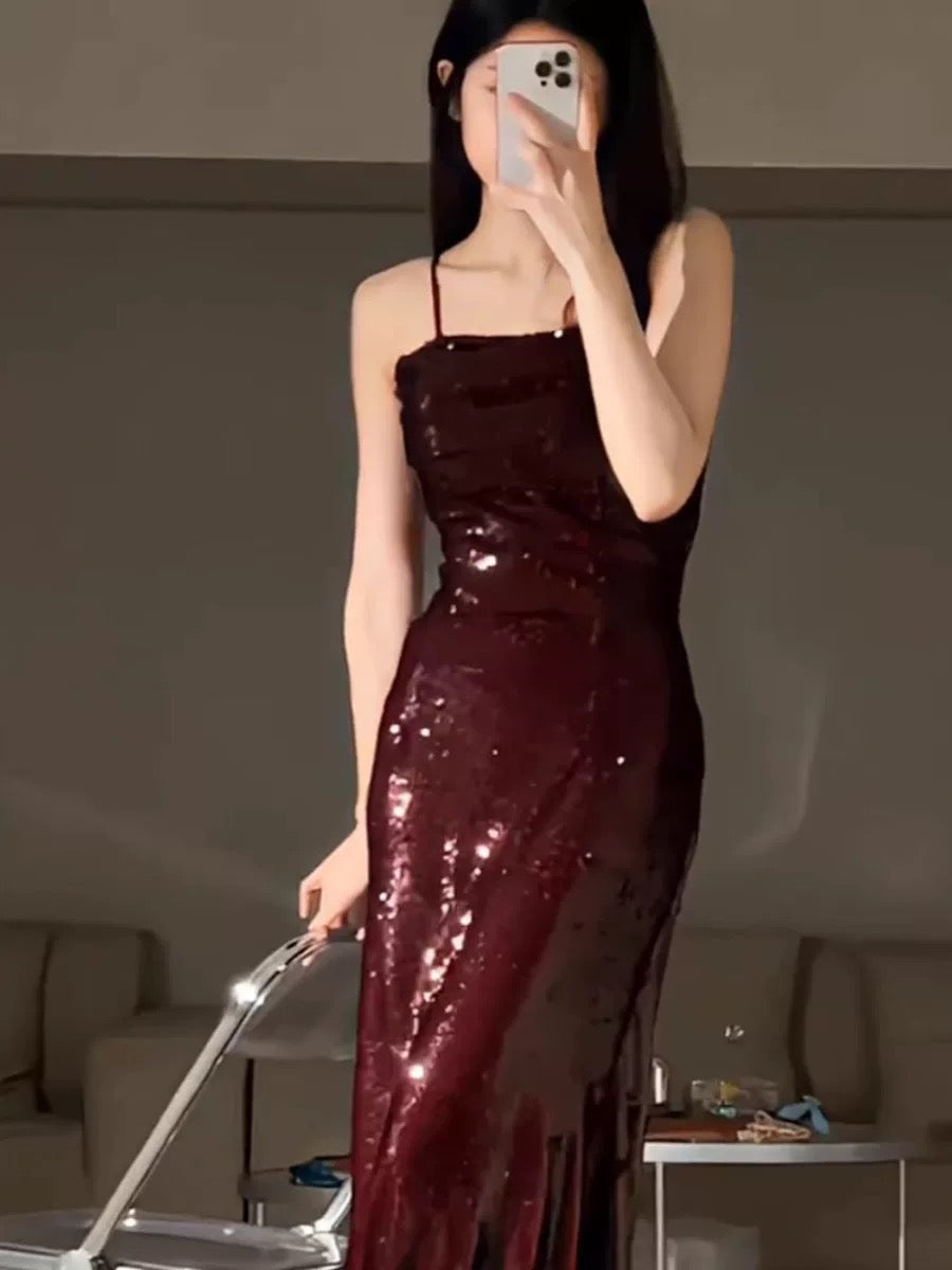 Gorgeous Mermaid Spaghetti Straps Burgundy Sequin Evening Dress Prom Dresses Birthday Outfits C3619