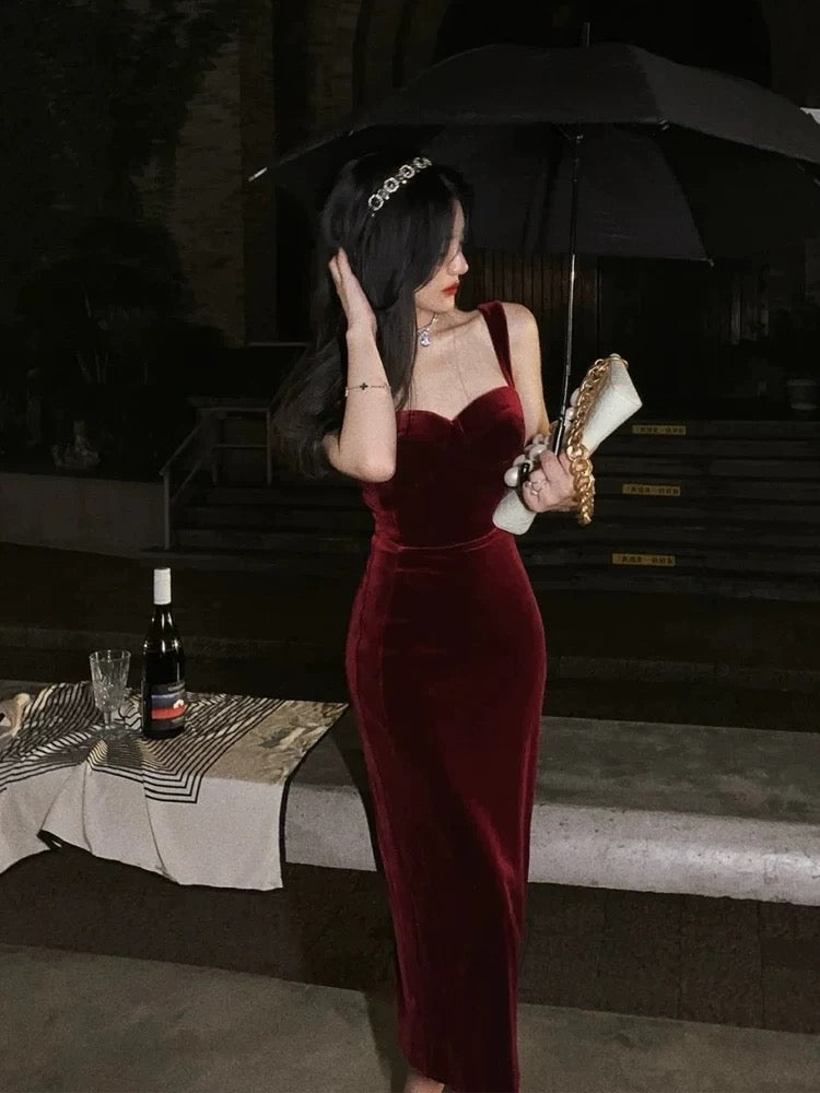Gorgeous Mermaid Straps Burgundy Velvet Evening Dress Prom Dresses Birthday Outfits C3620