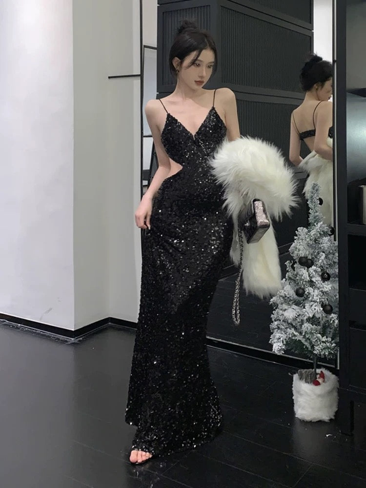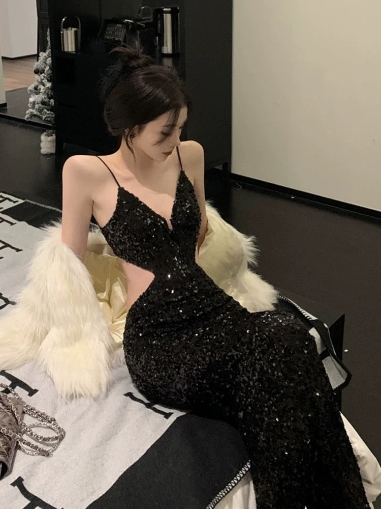 Gorgeous Sheath Spaghetti Straps Black Sequin Evening Dress Prom Dresses Birthday Outfits C3633