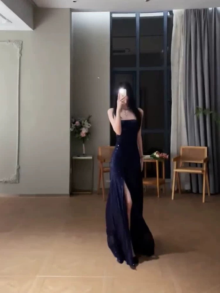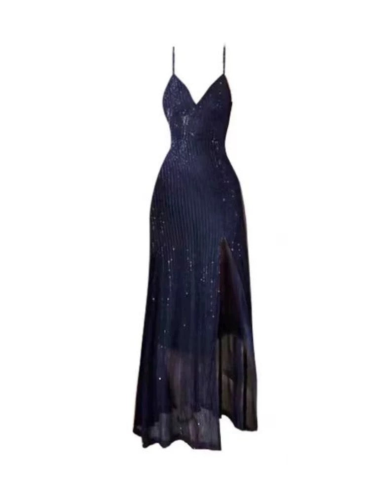 Gorgeous Sheath Spaghetti Straps Navy Blue Sequin Evening Dress Prom Dresses Birthday Outfits C3613