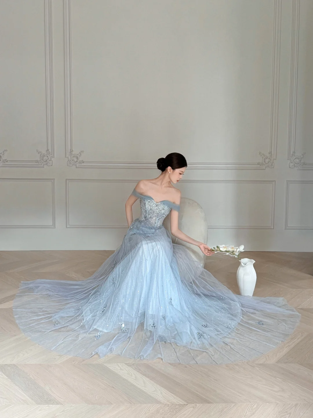 Obsessed A Line Off The Shoulder Tulle Beaded Without Sleeves Long Prom Dress, Evening Dress C6545