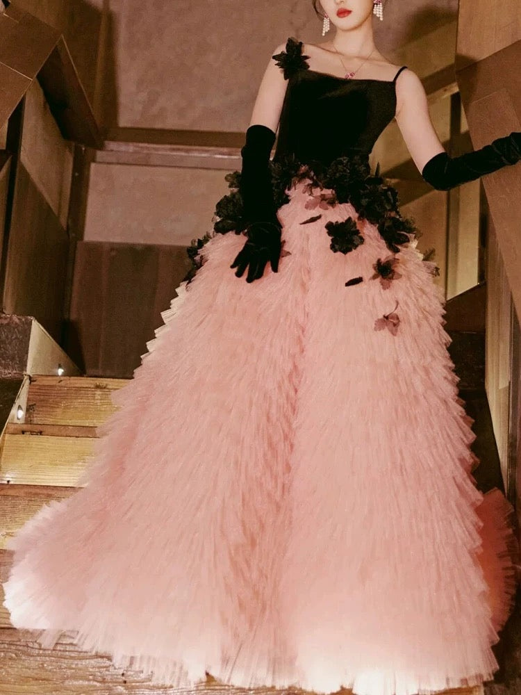 Pretty Ball Gown Straps Tulle Layers Long Pink Ruffles Prom Dresses Sweet 16 Dresses C3590