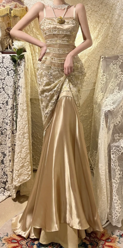Pretty Gold Mermaid Spaghetti Straps Satin Lace Sequin Without Sleeves Long Prom Dress, Evening Dress C6710